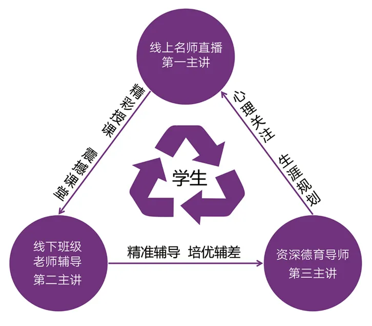 “三师课堂”逐渐构建起了“三师四方”的教学共同体,即“线上名师直播+线下老师个性辅导+德育导师成长指导”三师协同并进,“全国名师团直播+本校名师辅导+教学服务老师个性服务+德育名师指导”四方鼎力配合,真正打通“教”与“育”,为学生提供直播教学、德育发展、生涯规划、个性成长等全方位的服务。