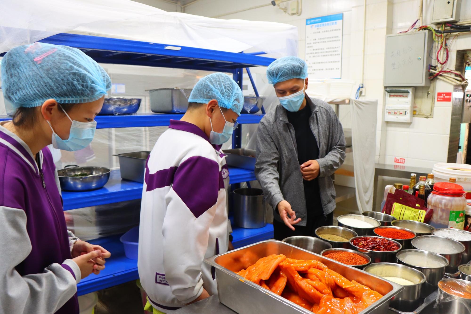 各年级代表学生集结康苑门口,由物业中心胡海涛老师向各位学生简要介绍此次参观活动的流程和意义,以及进入后厨的注意事项。随后,在所有参观人员戴好一次性头套和口罩后,胡海涛老师化身“导游”,带领学生走进后厨。按照食堂操作流程,带领大家逐一参观食材分拣区、食材加工区、烹饪区和餐具清洗消毒区、配餐区以及食堂管理台账区,让同学们亲眼观看一道道美食是如何通过验收、分拣、贮存、加工制作、留样、配餐和餐具清洁消毒的全过程。