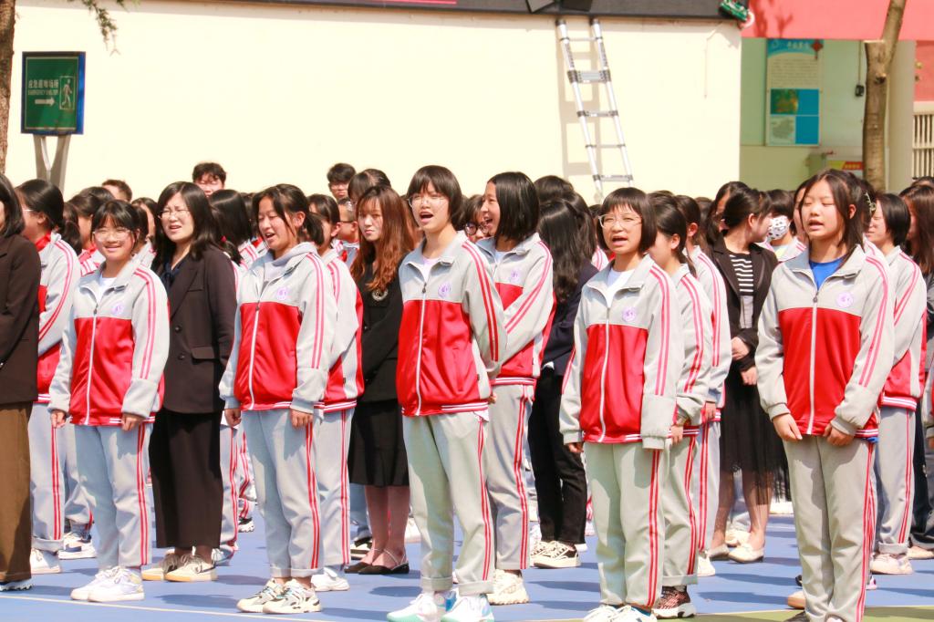 在庄重的升旗仪式后初一、初二、高一、高二学子为即将参加中高考的学长、学姐们加油助威。