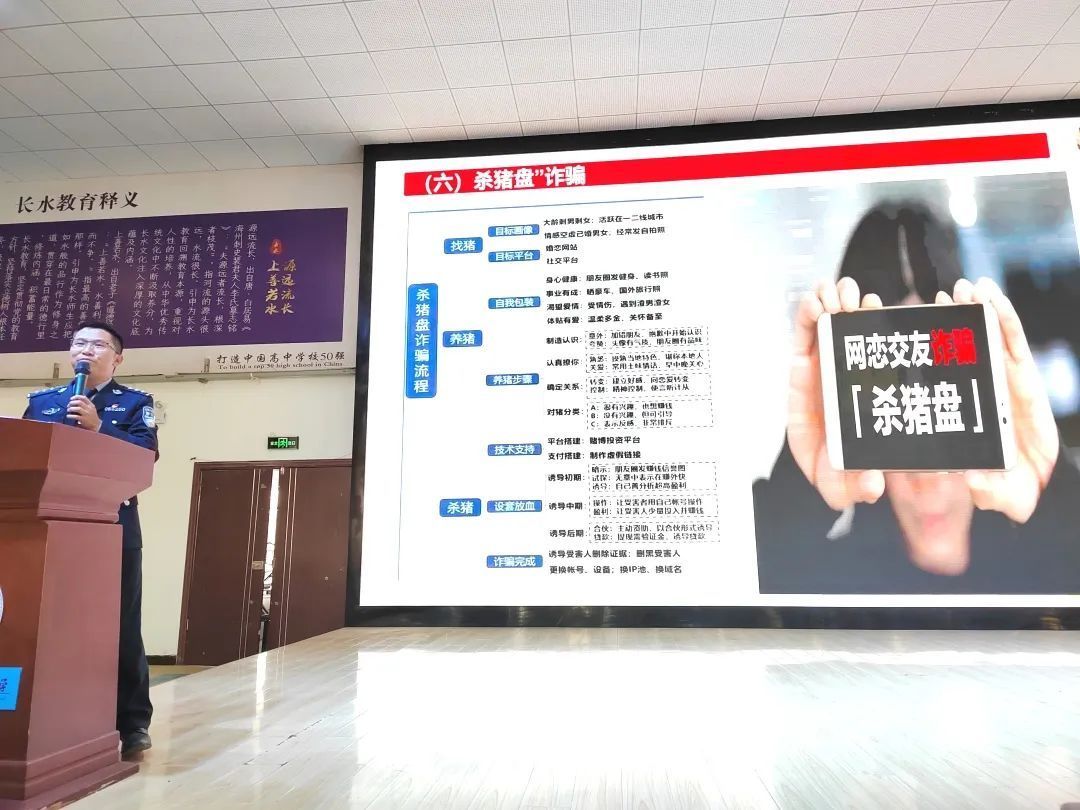 为了进一步提高校园师生的防诈、识骗能力,有效遏制电信网络诈骗犯罪在校园时有发生的情况,共建网络安全,营造健康文明的网络环境,维护风清气正的校园环境。2023年4月6日,昆明市公安局呈贡分局反诈中心刘文贤队长来到云南长水实验中学呈贡校区开展预防电信诈骗的专题讲座。