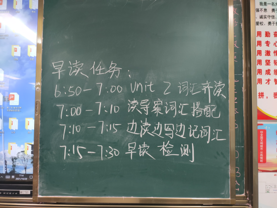6:50,同学们进入教室早读,而我则要在教室外守着,看看有没有“不老实”的同学。黑板上明确的早读任务让每位同学的早间学习更有方向,无论是齐读还是自由读,同学们的朗朗书声响彻整个校园。