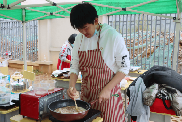 负责烹饪的同学动作麻利,用娴熟的技巧料理食材,制作美味,每一个环节、每一个步骤都有模有样,精湛的技艺尽展“厨神”风采。