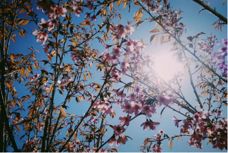 走到楼下,一片樱花树茂盛且鲜艳,阳光给它披上美丽金衣仰望着。也曾想起曾经我们的欢声笑语。当正视它时,又完全感觉不到身处在无趣的学校。嘈杂的喧闹中。看着远方一座座若隐若现的山被太阳光亮镶上一层金边,像一幅美丽的水彩画。