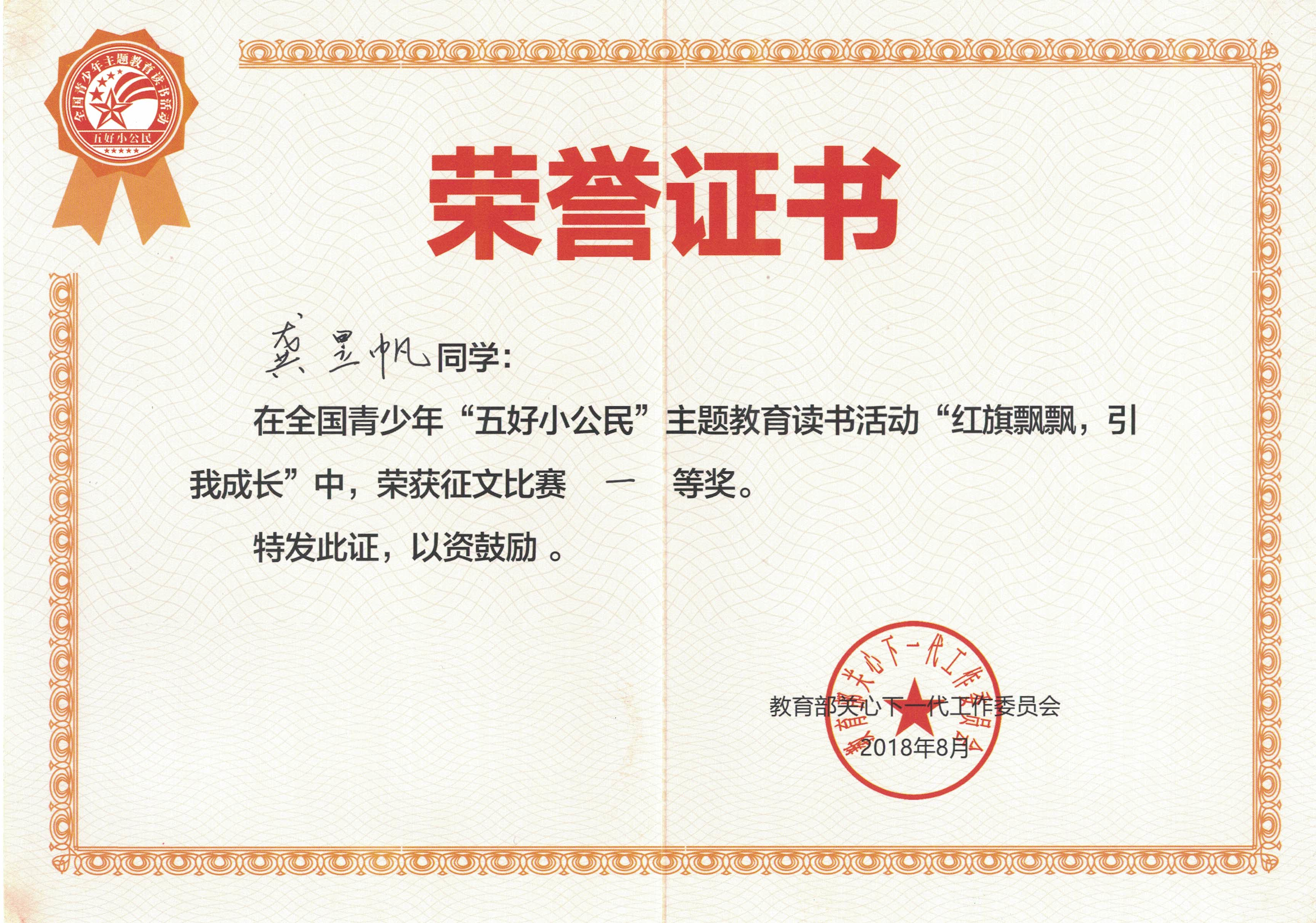 在教育部关心下一代工作委员会组织的全国青少年“五好小公民”主题教育读书活动“红旗飘飘,引我成长”中,我校多名师生被表彰奖励,荣获这一国家级殊荣。其中:张晶醇、邱晨云同学荣获征文比赛特等奖;袁梅、冯明、陈燕、李玲琦、彭富宏、董雨晨、龚昱帆同学荣获征文比赛一等奖;陈金柯、刘文才、王琰凯、杨文蔚、侯钰玲、张三和同学荣获征文比赛二等奖。李彩霞、杨杰、曹福保、季燕鹏、乔鹏老师荣获征文指导一等奖。