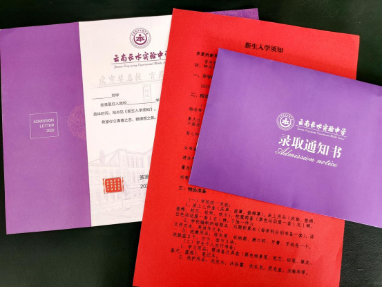 2022年,文山长水实验中学录取通知书以清华紫为主色调,辅以白色、金色,整体彰显雅致人文气息。